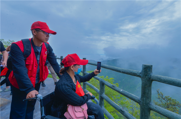 在費(fèi)縣天蒙山景區(qū),黨員志愿者陪同殘疾人朋友乘坐索道、途經(jīng)無障礙游步道到達(dá)了海拔近千米的世界第一人行玻璃懸索橋,和其他游客一同登山賞景,幫助他們實(shí)現(xiàn)無障礙旅游的夙愿。隨后,在《沂蒙山小調(diào)》誕生地,大家參觀展館,唱響沂蒙紅歌,追憶崢嶸往昔,緬懷革命先烈,開展了一堂生動(dòng)的黨史教育課。