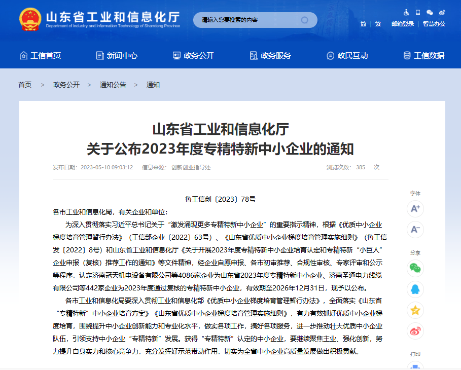 據(jù)了解,專精特新中小企業(yè)是指在產(chǎn)品、技術(shù)、管理、模式等方面創(chuàng)新能力強(qiáng)、專注細(xì)分市場、成長性好的中小企業(yè),是推動經(jīng)濟(jì)社會發(fā)展的重要力量。根據(jù)相關(guān)文件精神,省工業(yè)和信息化廳組織開展了2023年度專精特新中小企業(yè)培育認(rèn)定和專精特新“小巨人”企業(yè)申報(bào)(復(fù)核)推薦工作。經(jīng)企業(yè)自愿申報(bào)、各市初審?fù)扑]、合規(guī)性審核、專家評審和公示等程序,認(rèn)定4086家企業(yè)為山東省2023年度專精特新中小企業(yè)、442家企業(yè)為2023年度通過復(fù)核的專精特新中小企業(yè),有效期至2026年12月31日。