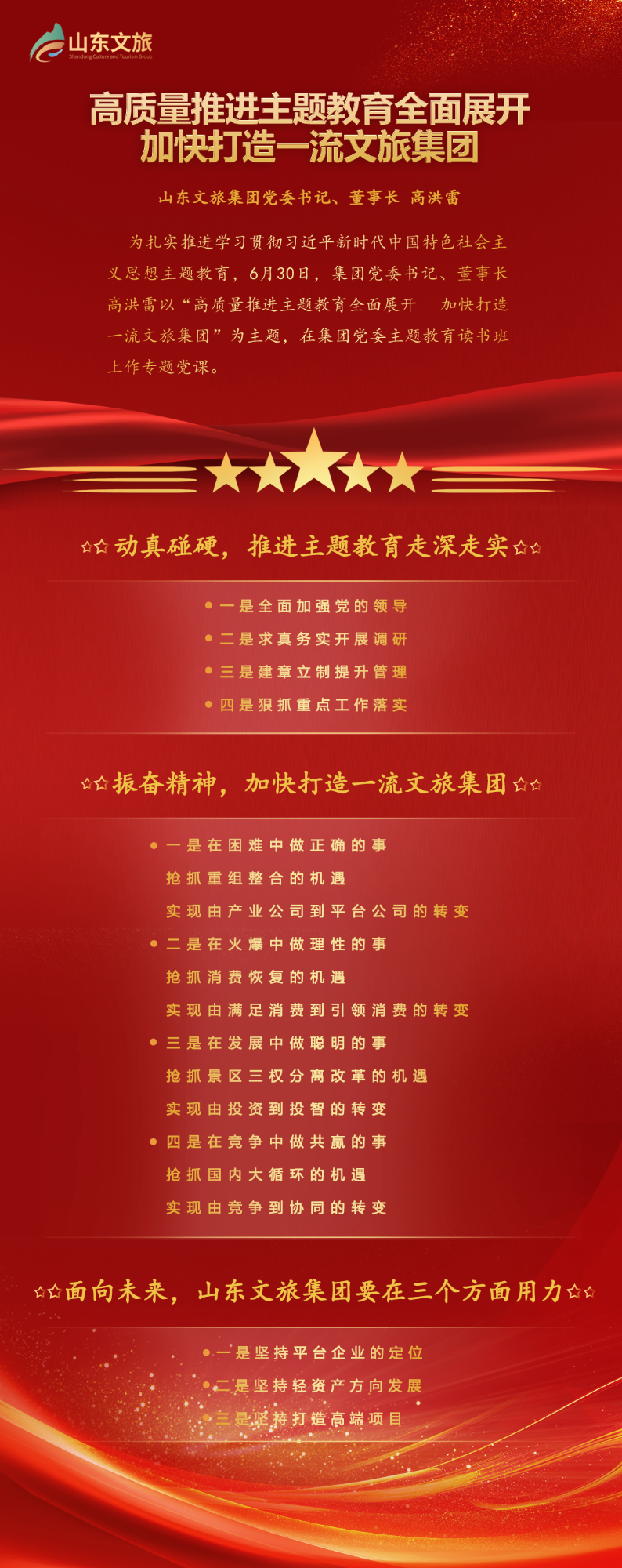 為扎實推進(jìn)學(xué)習(xí)貫徹習(xí)近平新時代中國特色社會主義思想主題教育,6月30日,集團(tuán)黨委書記、董事長高洪雷以“高質(zhì)量推進(jìn)主題教育全面展開 加快打造一流文旅集團(tuán)”為主題,在集團(tuán)黨委主題教育讀書班上作專題黨課,集團(tuán)黨委副書記、總經(jīng)理丁藝主持。