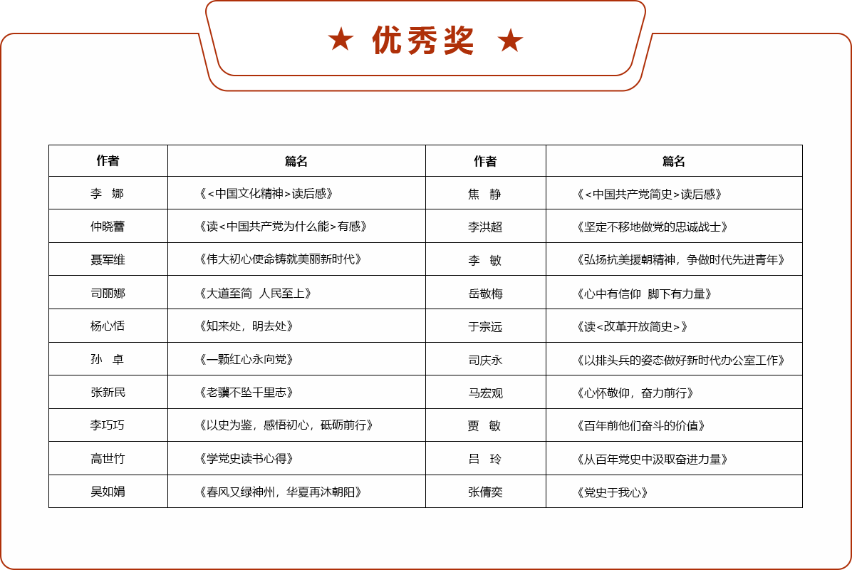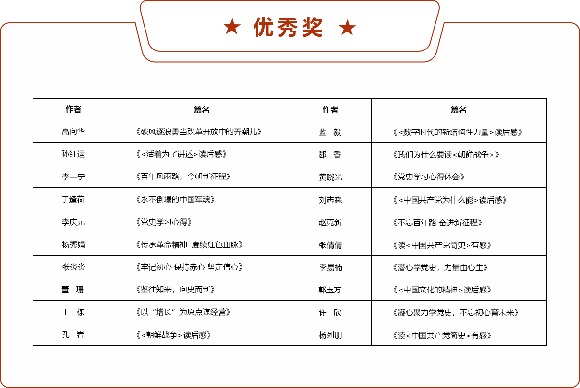 2021年是中國共產(chǎn)黨成立100周年,集團(tuán)黨委黨史學(xué)習(xí)教育領(lǐng)導(dǎo)小組辦公室在全集團(tuán)范圍內(nèi)組織開展了“牢記初心  保持赤心  堅定信心”黨史學(xué)習(xí)讀書競賽活動。經(jīng)初評、復(fù)評及終審三輪評審,審定100篇獲獎作品,其中一等獎10名、二等獎20名、三等獎30名、優(yōu)秀獎40名,共有3家單位榮獲優(yōu)秀組織獎。2022年9月22日在濟(jì)南舉行頒獎典禮。
