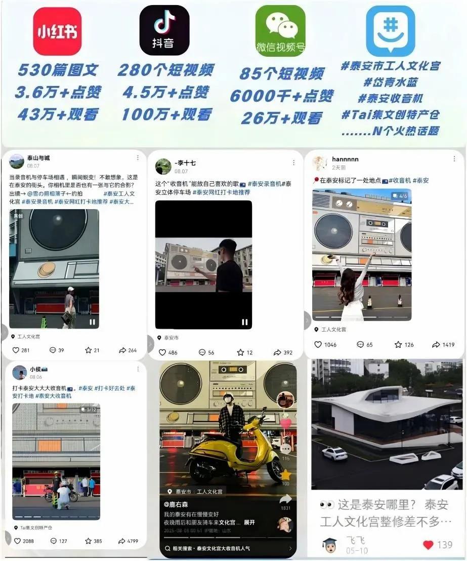 作為項(xiàng)目的策劃設(shè)計(jì)及建設(shè)運(yùn)營方,山東文旅山鄉(xiāng)集團(tuán)運(yùn)營團(tuán)隊(duì)以創(chuàng)意營銷雙核引擎,塑造泰安文旅新地標(biāo)。全新落成的“立體車庫·時(shí)光收音機(jī)”以工業(yè)風(fēng)聲光藝術(shù)重塑空間記憶,線上話題霸榜熱搜,新媒體平臺(tái)綜合熱度高達(dá)177.8萬(截至8月12日);聯(lián)動(dòng)園區(qū)各業(yè)態(tài)啟動(dòng)的“暑期七彩消費(fèi)季”,通過主題色打卡、跨業(yè)態(tài)融合等多元場(chǎng)景,激活經(jīng)濟(jì)新勢(shì)能。一系列創(chuàng)新運(yùn)營與宣傳舉措,帶來了顯著的熱搜效應(yīng)與關(guān)注度提升,成功將岱青水藍(lán)塑造為城市潮流新地標(biāo)與文旅打卡點(diǎn),為泰安夜經(jīng)濟(jì)及文旅消費(fèi)注入強(qiáng)勁動(dòng)能。街區(qū)自今年“五一”試營業(yè)以來,總營收突破626萬元,客流量達(dá)7萬余人次。