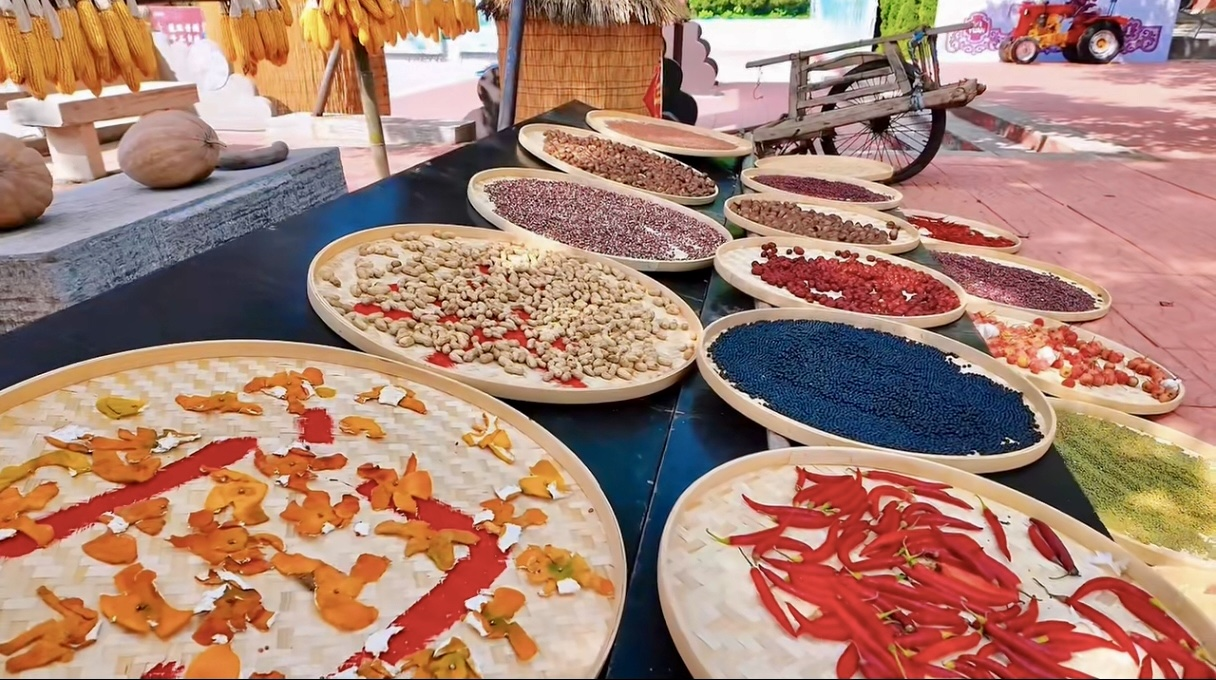 秋日的石門坊,一場(chǎng)與眾不同的“豐收美學(xué)”正在上演。百年核桃樹(shù)下,玉米、辣椒、谷物拼組成巨大的豐收?qǐng)D騰;東方紅拖拉機(jī)、小推車、懷舊唱片機(jī)重現(xiàn)8090年代潮流場(chǎng)景——這不是傳統(tǒng)的民俗節(jié)慶,而是一場(chǎng)融合農(nóng)耕文化與現(xiàn)代創(chuàng)意的“新農(nóng)潮”盛宴。