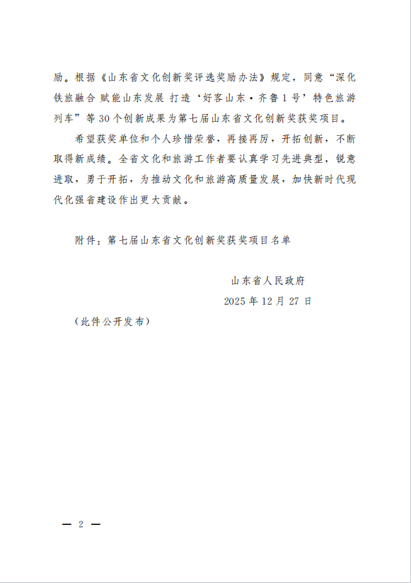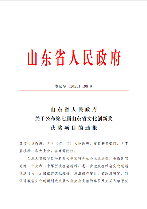 據(jù)悉,山東省文化創(chuàng)新獎是由山東省人民政府設立的文化創(chuàng)新類獎項,由省文化和旅游廳承辦,每兩年舉辦一屆,本屆共表彰30項文化創(chuàng)新優(yōu)秀成果,涵蓋文化和旅游產(chǎn)業(yè)發(fā)展、鄉(xiāng)村文化振興與公共文化服務等領(lǐng)域,旨在表彰獎勵近年來文化創(chuàng)新實踐成果,進一步激發(fā)全社會文化創(chuàng)新創(chuàng)造活力,加快推進文化強省、旅游強省建設。