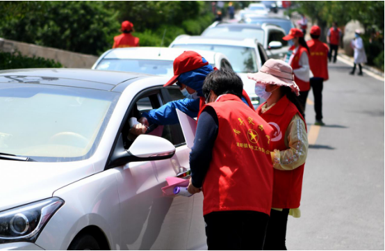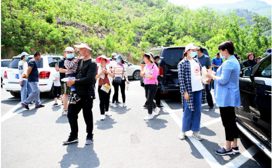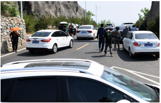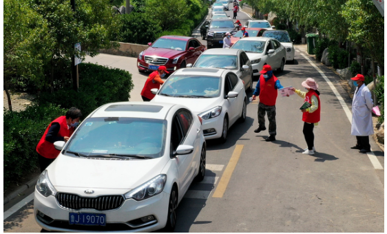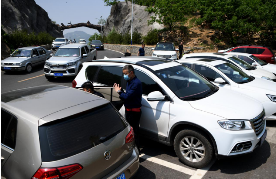 在九女峰游客接待中心附近,數(shù)十名志愿者為前往度假區(qū)的游客一一登記并測(cè)量體溫,車輛排出了綿延數(shù)百米的長(zhǎng)龍。
