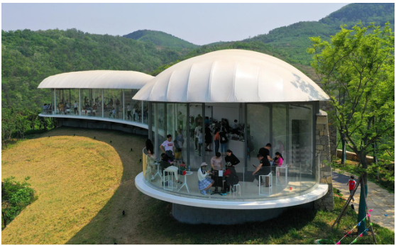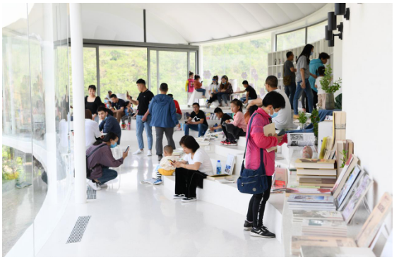 在九女峰“故鄉(xiāng)的云”書房?jī)?nèi),五湖四海的游客慕名而來,盡享云朵里讀書的愜意……