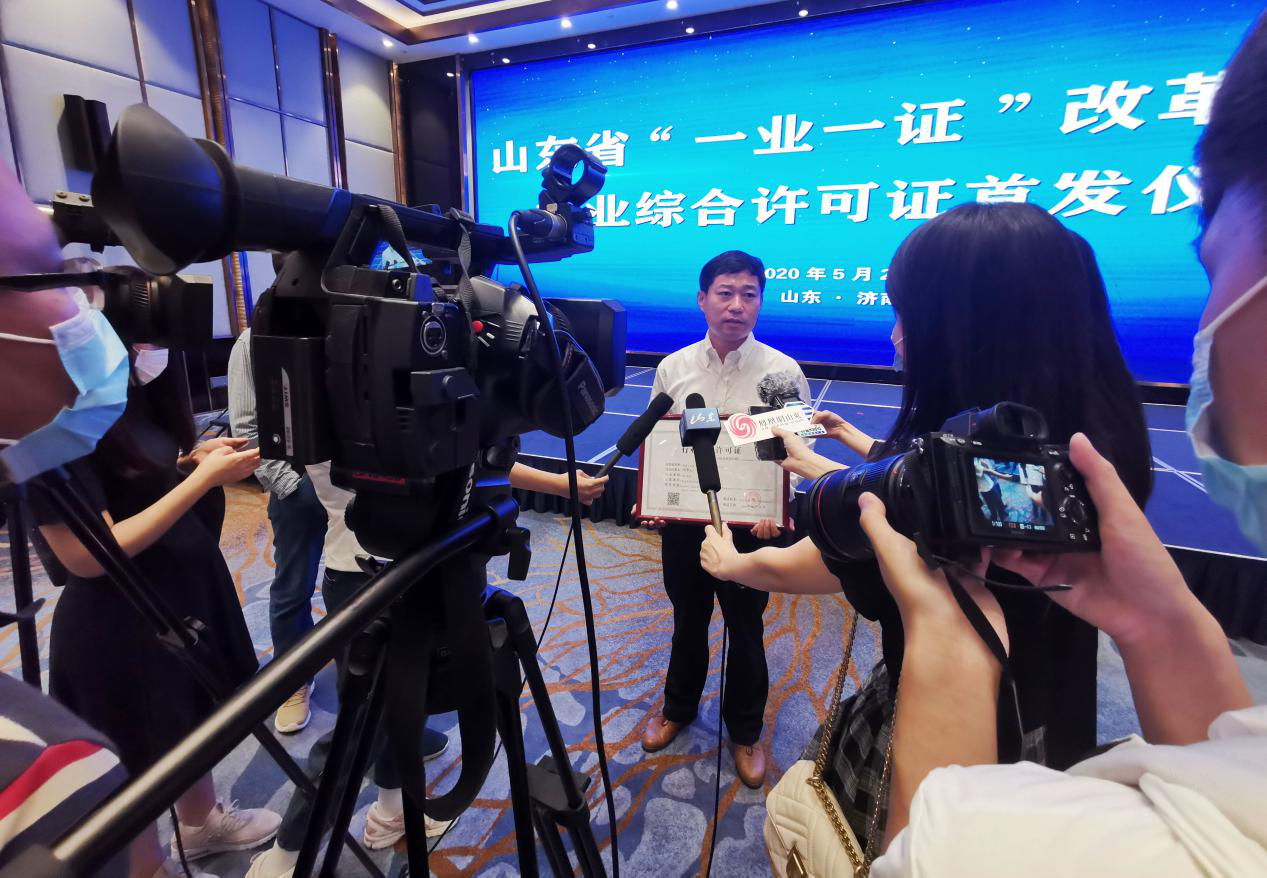 5月27日,山東省“一業(yè)一證”改革試點行業(yè)綜合許可證首證頒發(fā)儀式在濟(jì)南舉行。山東省副省長任愛榮向20個行業(yè)頒發(fā)了行業(yè)綜合許可證,魯商九女峰(泰安)鄉(xiāng)村振興有限公司總經(jīng)理于在武第一個上臺領(lǐng)取許可證。山東首次頒發(fā)行政綜合許可證標(biāo)志著我省“一業(yè)一證”改革邁出了重要的一步,將最大限度減材料、簡環(huán)節(jié)、壓時限,讓企業(yè)群眾少跑腿、不跑腿,是我省深化商事制度改革,破解“準(zhǔn)入不準(zhǔn)營”難題,實現(xiàn)“一窗受理·一次辦好”的重大改革舉措。山東省委常委劉強出席儀式并致辭。