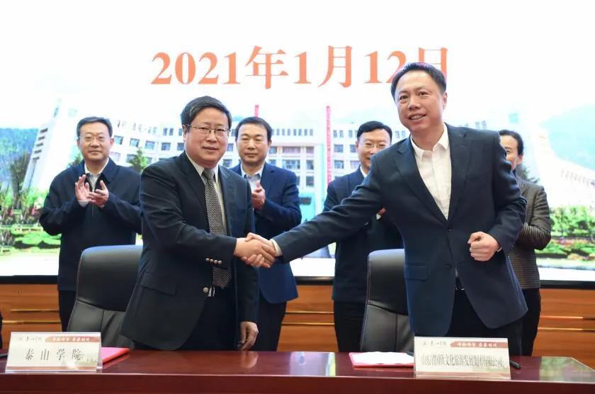 丁藝代表國(guó)欣文旅與泰山學(xué)院院長(zhǎng)秦夢(mèng)華簽訂《泰山學(xué)院與山東省國(guó)欣文化旅游發(fā)展集團(tuán)有限公司共建泰山國(guó)欣智慧文旅產(chǎn)業(yè)學(xué)院合作協(xié)議書》。