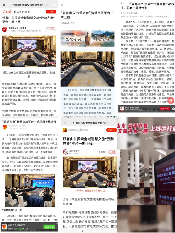 經(jīng)過先期預(yù)熱,智慧文旅平臺的上線吸引了大眾和媒體的關(guān)注。截至4月30日下午,魯網(wǎng)監(jiān)測到與“智慧文旅平臺上線”有關(guān)的新聞報道696篇。中國新聞網(wǎng)發(fā)布原創(chuàng)稿件《好客山東探索全域智慧文旅“云游齊魯”平臺一期上線》,山東衛(wèi)視《新聞聯(lián)播》重磅播報《“好客山東 云游齊魯”智慧文旅平臺上線》,大眾日報客戶端推出文章《“五一”去哪兒?搜索“云游齊魯”小程序,總有一款適合你》,文旅山東微信公眾號、齊魯壹點發(fā)文《“好客山東 云游齊魯”智慧文旅平臺正式上線》,山東商報在頭版、4-5版等版面刊發(fā)2篇文章《齊魯風韻插上科技翅膀》《國欣文旅的“智慧”布局》。