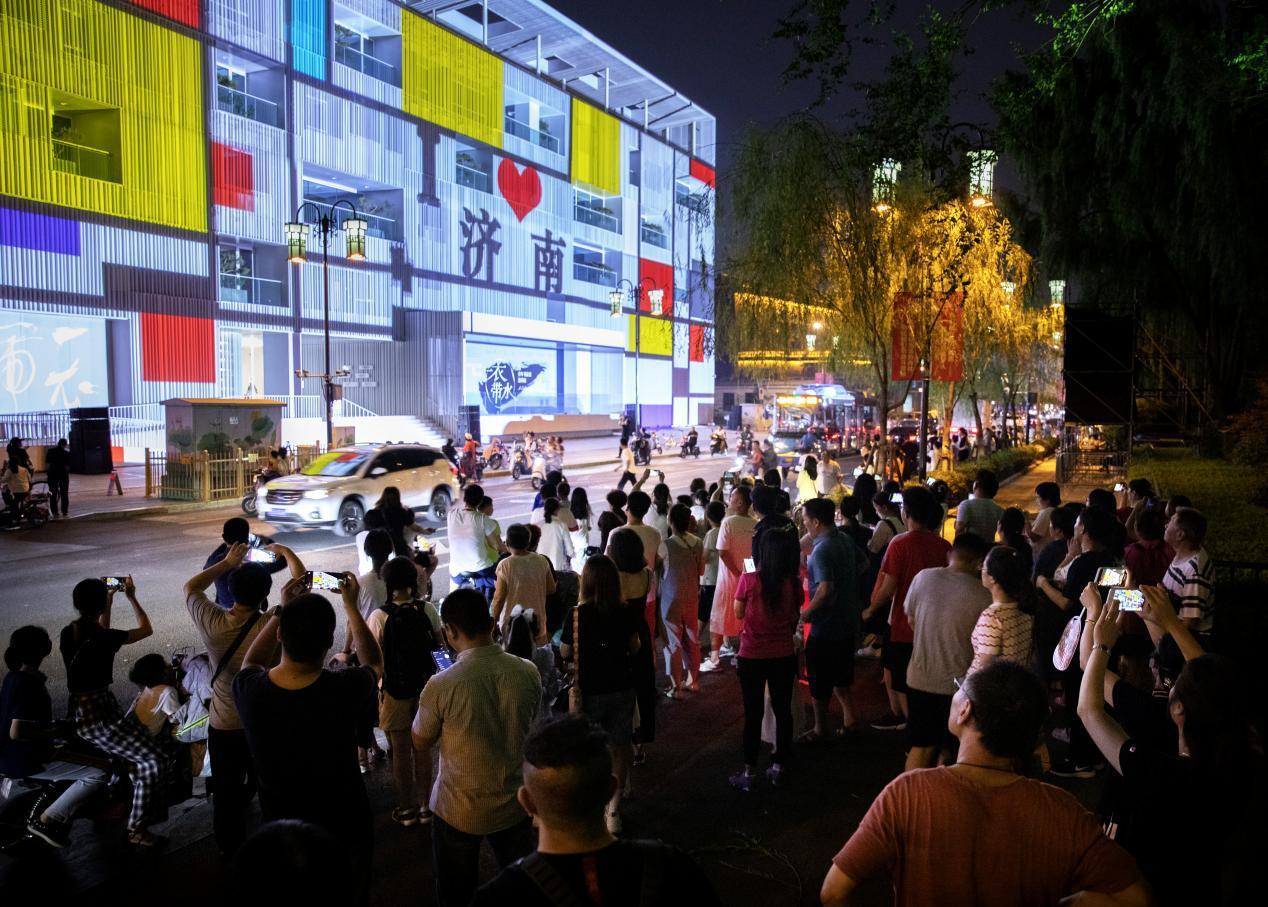 活動(dòng)中,一場(chǎng)致敬中國傳統(tǒng)文化精神、鏈接國際當(dāng)代藝術(shù)風(fēng)尚潮流的“Light it up·點(diǎn)亮濟(jì)南光影展”在每晚19點(diǎn)30分至22點(diǎn)準(zhǔn)時(shí)扮靚大明湖,絢麗的光影刷爆了泉城市民的朋友圈。這場(chǎng)“藝術(shù)”與“科技”融合的沉浸式視覺盛宴點(diǎn)亮了城市夜經(jīng)濟(jì),刷新了泉城市民的感官體驗(yàn)。