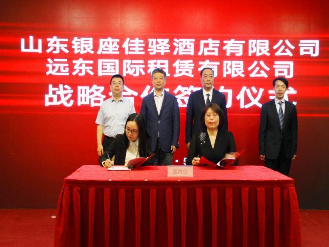 5月30日上午,泉城大酒店,銀座佳驛投資加盟招商會現場,首批8家文度酒店合作伙伴聯合簽約,銀座佳驛與遠東國際租賃戰(zhàn)略合作簽約。