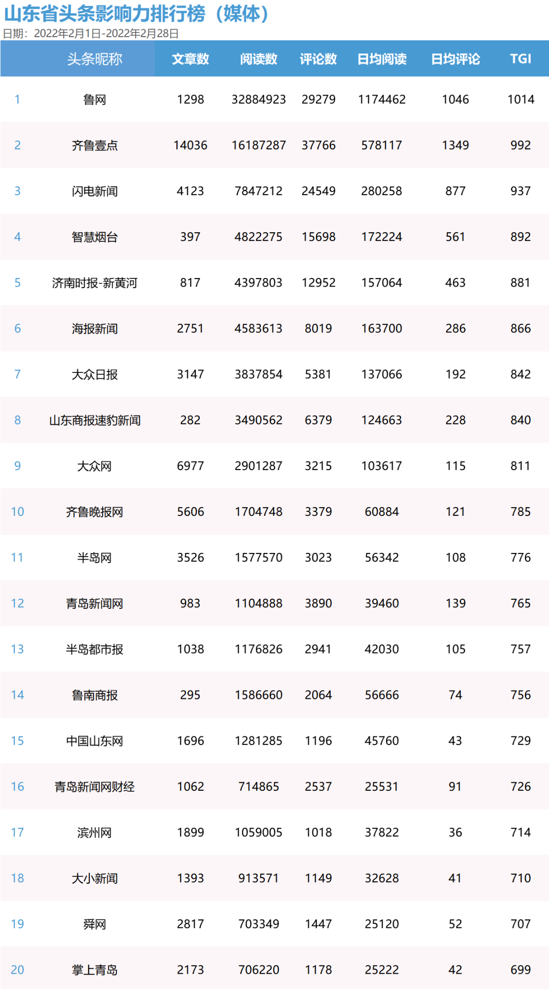 在此前發(fā)布的1月份山東省頭條影響力排行榜(媒體)中,“魯網(wǎng)”均篇傳播效果最佳,篇均閱讀量突破3萬(wàn),共獲得4021萬(wàn)閱讀量、129萬(wàn)日均閱讀量和5萬(wàn)評(píng)論數(shù),超過(guò)榜單中其他媒體賬號(hào),以1040的TGI值位列第一。