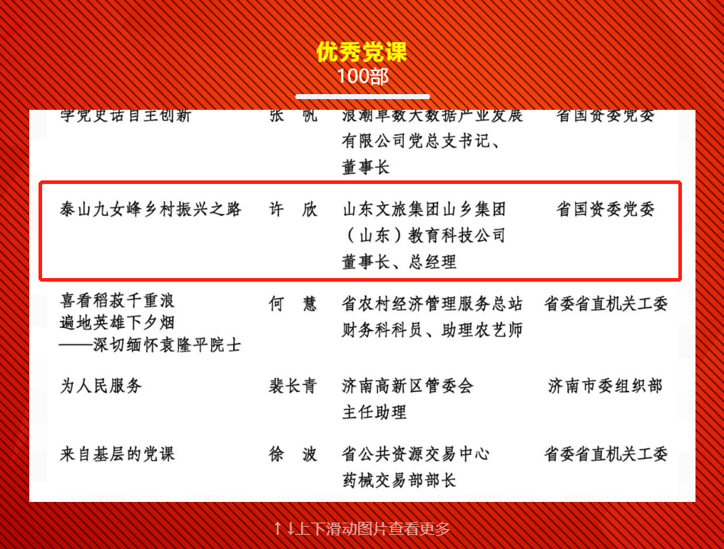 “腳下沾滿泥土,心中充滿熱愛”,山東文旅所屬山鄉(xiāng)集團(tuán)優(yōu)秀黨員許欣,飽含深情地開啟了《泰山九女峰鄉(xiāng)村振興之路》的講述,黨課作品共分為“守初心·黨建引領(lǐng)”“敢擔(dān)當(dāng)·振興藍(lán)圖”“促發(fā)展·產(chǎn)業(yè)賦能”“走在前·齊魯樣板”四個(gè)章節(jié),設(shè)計(jì)巧妙、內(nèi)容豐富,將山東文旅鄉(xiāng)村振興故事娓娓道來,全面展示了山東文旅人牢記囑托走在前、勇?lián)姑_新局的勇氣和毅力,用每一次行動(dòng)、每一個(gè)成功經(jīng)驗(yàn)譜寫新時(shí)代文旅人的使命與擔(dān)當(dāng)。