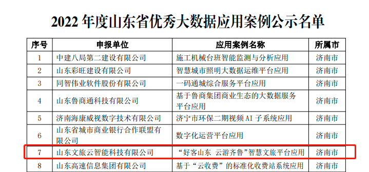 近期,山東文旅云智能科技有限公司(簡稱“文旅云公司”)喜訊頻傳。由文旅云公司承建的“好客山東 云游齊魯”智慧文旅平臺入選山東省工業(yè)和信息化廳組織評選的“三優(yōu)兩重項目”名單(2022年度山東省優(yōu)秀大數(shù)據(jù)應(yīng)用案例),文旅云公司入選山東省工業(yè)和信息化廳組織評選的“2022年度山東省創(chuàng)新型中小企業(yè)”名單。同時,文旅云公司總經(jīng)理曲磊榮獲由山東省數(shù)字經(jīng)濟協(xié)會評選的2022年度山東省大數(shù)據(jù)產(chǎn)業(yè)“領(lǐng)軍人物”。