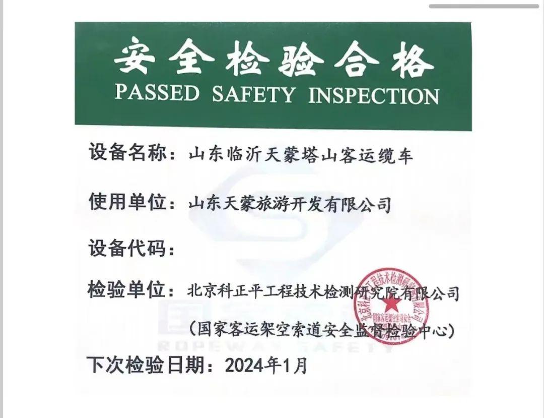 專(zhuān)家組一致認(rèn)為天蒙山觀光纜車(chē)設(shè)備運(yùn)轉(zhuǎn)狀況正常,安全管理制度健全、設(shè)備管理規(guī)范、資料充足完整,各項(xiàng)技術(shù)指標(biāo)及管理規(guī)范符合國(guó)家安全運(yùn)行標(biāo)準(zhǔn)和《客運(yùn)地面纜車(chē)技術(shù)規(guī)范》的要求,認(rèn)定天蒙山觀光纜車(chē)檢驗(yàn)合格。這標(biāo)志著天蒙山觀光纜車(chē)已具備安全運(yùn)營(yíng)能力,可正式對(duì)外營(yíng)業(yè),承擔(dān)運(yùn)送游客上下山游覽景區(qū)的任務(wù)。