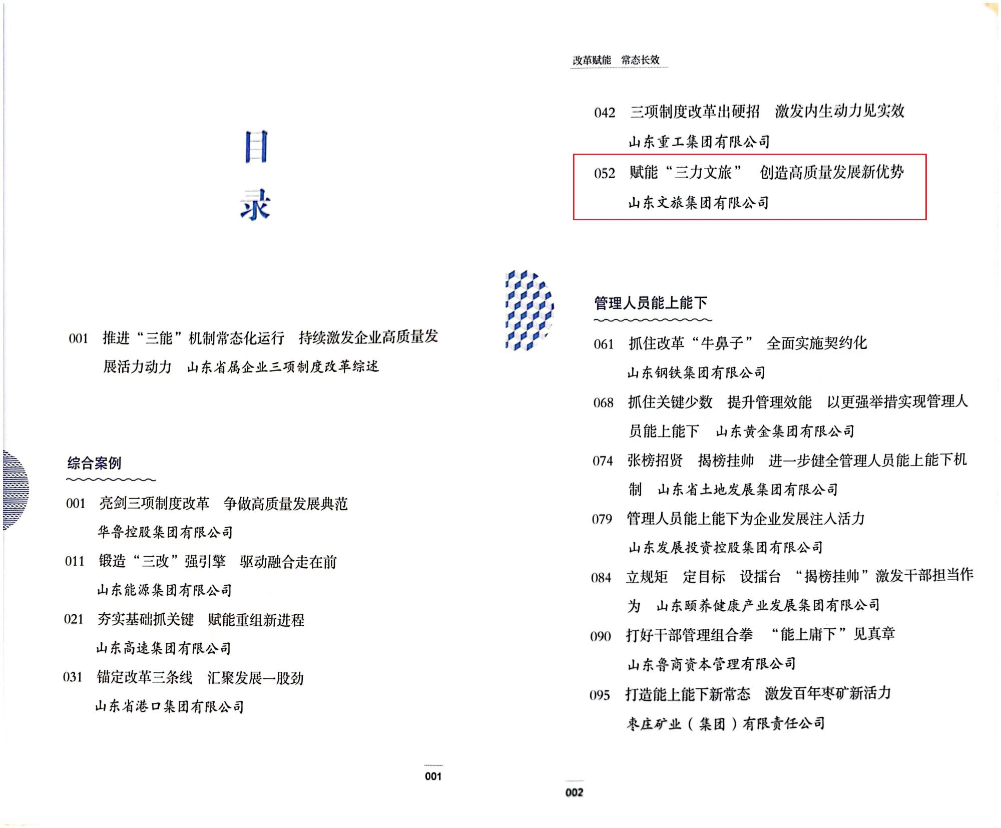 近日,山東省國資委黨委組織編寫出版了《改革賦能 常態(tài)長效——山東省屬企業(yè)三項制度改革探索與實踐》。本書收錄了省屬企業(yè)在推進(jìn)三項制度改革中探索形成的典型經(jīng)驗做法,充分展現(xiàn)了省屬企業(yè)三項制度改革取得的豐碩成果。集團(tuán)《賦能“三力文旅” 創(chuàng)造高質(zhì)量發(fā)展新優(yōu)勢》作為6家省屬企業(yè)之一,唯一一家委管企業(yè)入選綜合案例。此外,酒店集團(tuán)《推進(jìn)一控一管三輔助 助力企業(yè)逆境突圍》和山鄉(xiāng)集團(tuán)《積極探索市場化選人用人機(jī)制 全力激發(fā)鄉(xiāng)村振興建設(shè)澎湃新動能》分別入選收入能增能減和員工能進(jìn)能出專項案例。