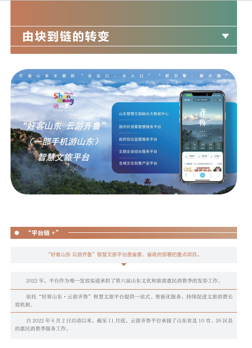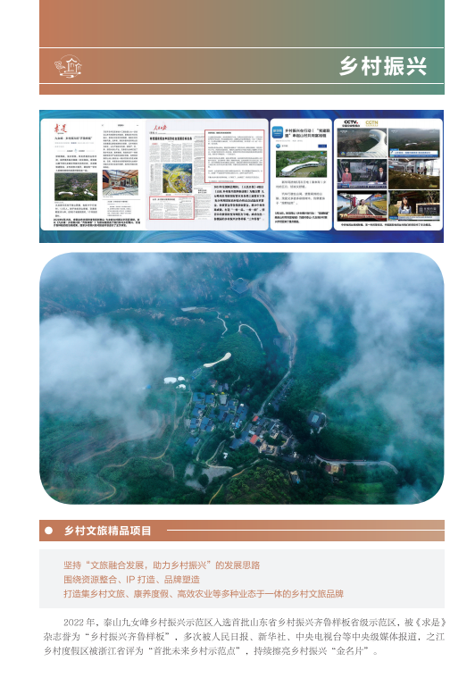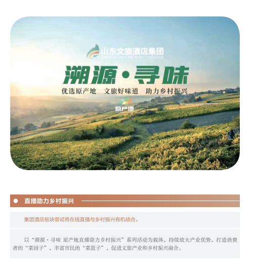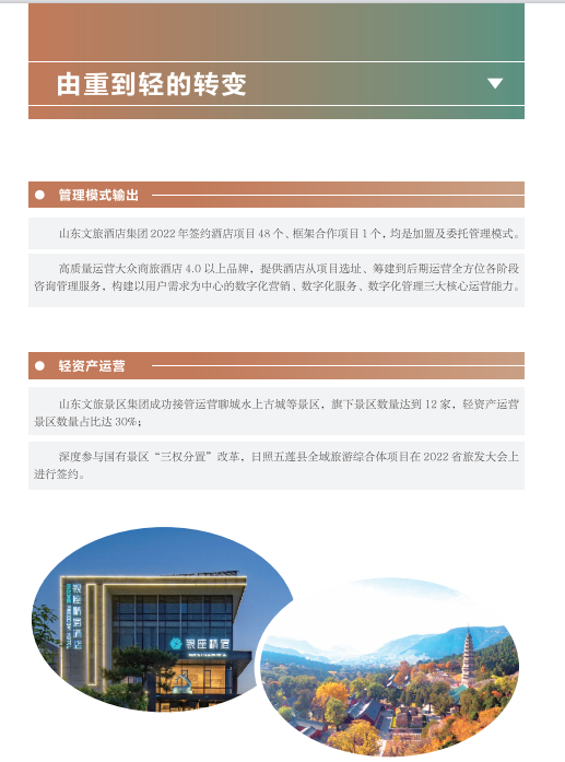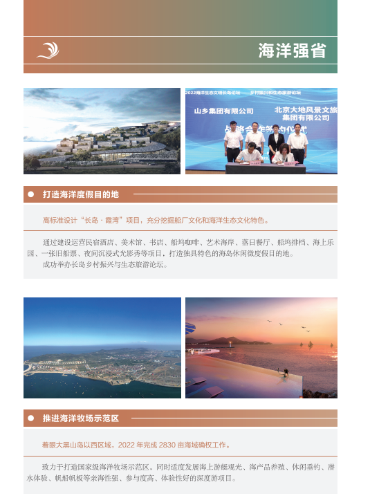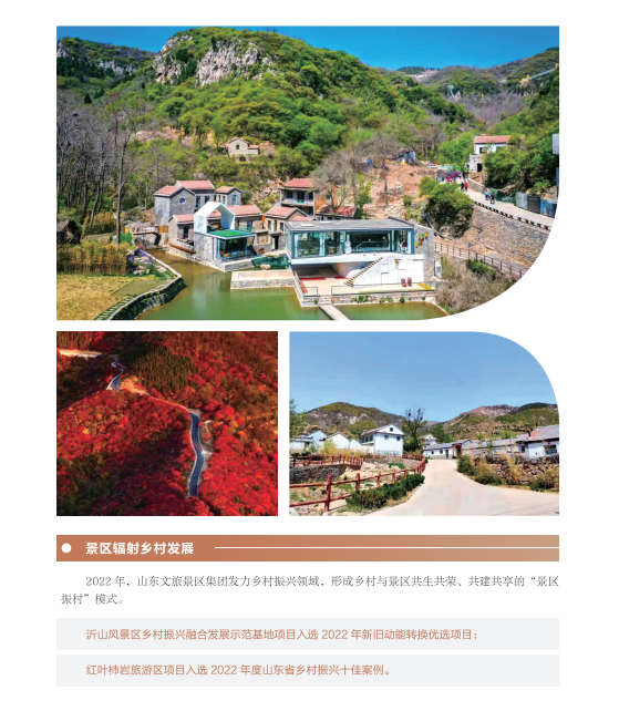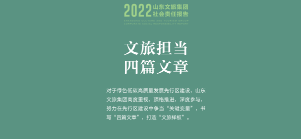 近年來,山東文旅集團秉承“服務山東大局、服務人民大眾”的國企使命,積極履行社會責任。認真學習貫徹黨的二十大精神,以黨建為引領,持續(xù)提升企業(yè)管理水平;高度重視綠色低碳高質量發(fā)展,努力在鄉(xiāng)村振興、海洋強省、黃河戰(zhàn)略、山東手造“四篇文章”等方面發(fā)揮優(yōu)勢、有所作為,打造泰山九女峰鄉(xiāng)村振興示范區(qū)等系列樣板工程;克服疫情沖擊,謀求差異化發(fā)展,推動由重到輕、由塊到鏈、由競到合“三個轉變”;組織豐富多彩文化活動,開展典型選樹,關愛員工發(fā)展。