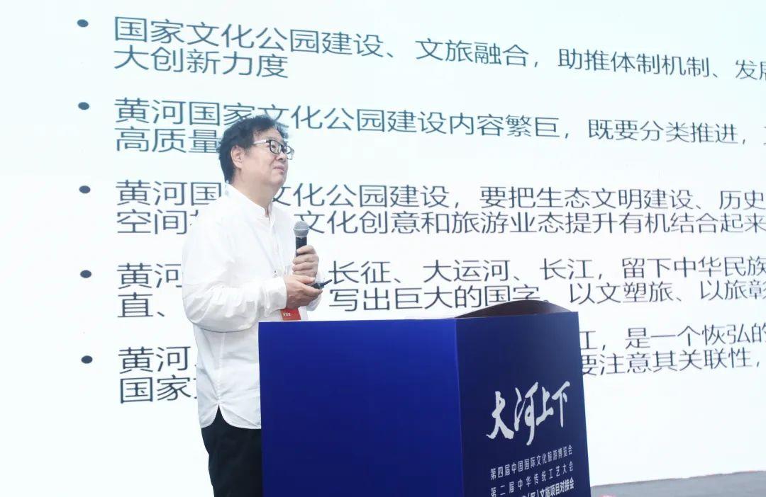 為促進沿黃?。▍^(qū))文旅資源優(yōu)勢盡快破題落地,打造合作共贏的一體化平臺,本次對接會特別設置主旨演講環(huán)節(jié),邀請業(yè)內(nèi)專家建言獻策。全國政協(xié)委員,文化文史和學習委員會委員,國家文化公園專家咨詢委員會總協(xié)調(diào)人,中國藝術(shù)研究院原院長、研究員韓子勇作題為《破題黃河國家文化公園建設推進路徑》的主旨演講。