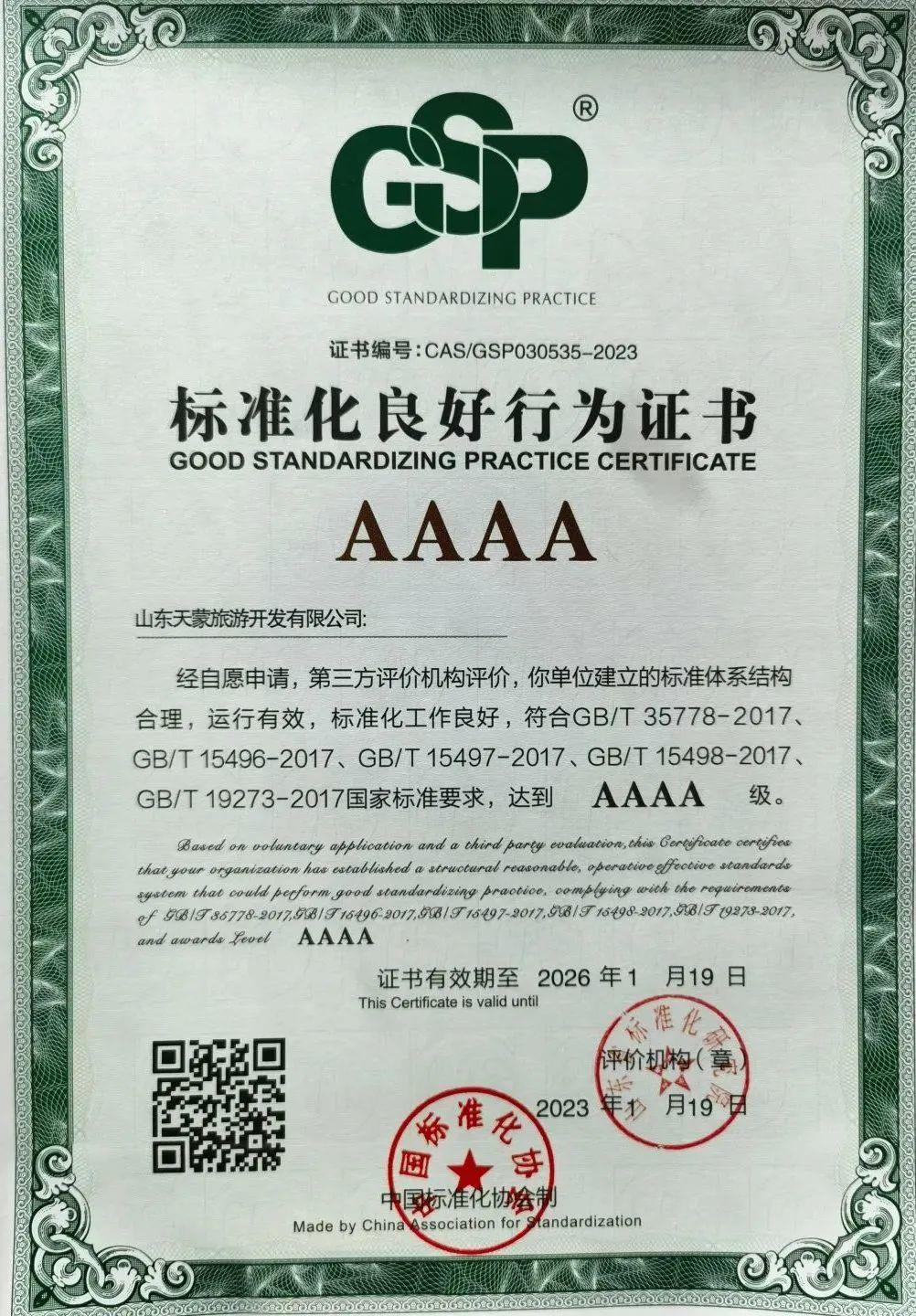 一直以來,天蒙景區(qū)從戰(zhàn)略高度將“標準化引領(lǐng)服務(wù)質(zhì)量提升”的理念貫穿于景區(qū)發(fā)展的全過程。景區(qū)在2019年通過省級服務(wù)標準化試點項目驗收的基礎(chǔ)上,于2021年度成功立項了國家級服務(wù)業(yè)標準化試點項目,又在2022年3月啟動了標準化良好行為企業(yè)創(chuàng)建工作。2023年獲評4A級“標準化良好行為企業(yè)”,成為臨沂市首家榮獲此殊榮的旅游景區(qū)。