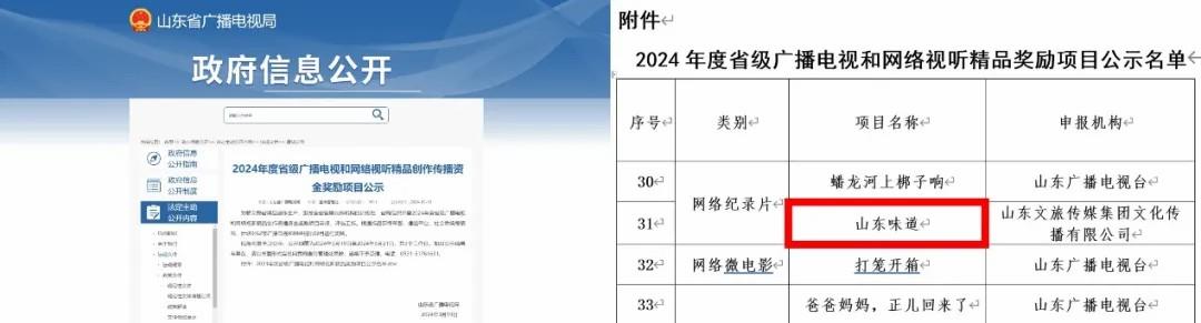 近日,山東省廣播電視局組織開展2024年度省級(jí)廣播電視和網(wǎng)絡(luò)視聽(tīng)精品創(chuàng)作傳播資金獎(jiǎng)勵(lì)項(xiàng)目的申報(bào)、評(píng)選工作。由山東省商務(wù)廳、山東文旅集團(tuán)出品,山東文旅傳媒集團(tuán)、山東文旅傳媒集團(tuán)文化傳播有限公司、山東映訊文化傳播有限公司聯(lián)合出品的山東風(fēng)味系列美食紀(jì)錄片《山東味道》在眾多申報(bào)項(xiàng)目中脫穎而出,入選2024年度省級(jí)廣播電視和網(wǎng)絡(luò)視聽(tīng)精品創(chuàng)作傳播資金獎(jiǎng)勵(lì)項(xiàng)目。