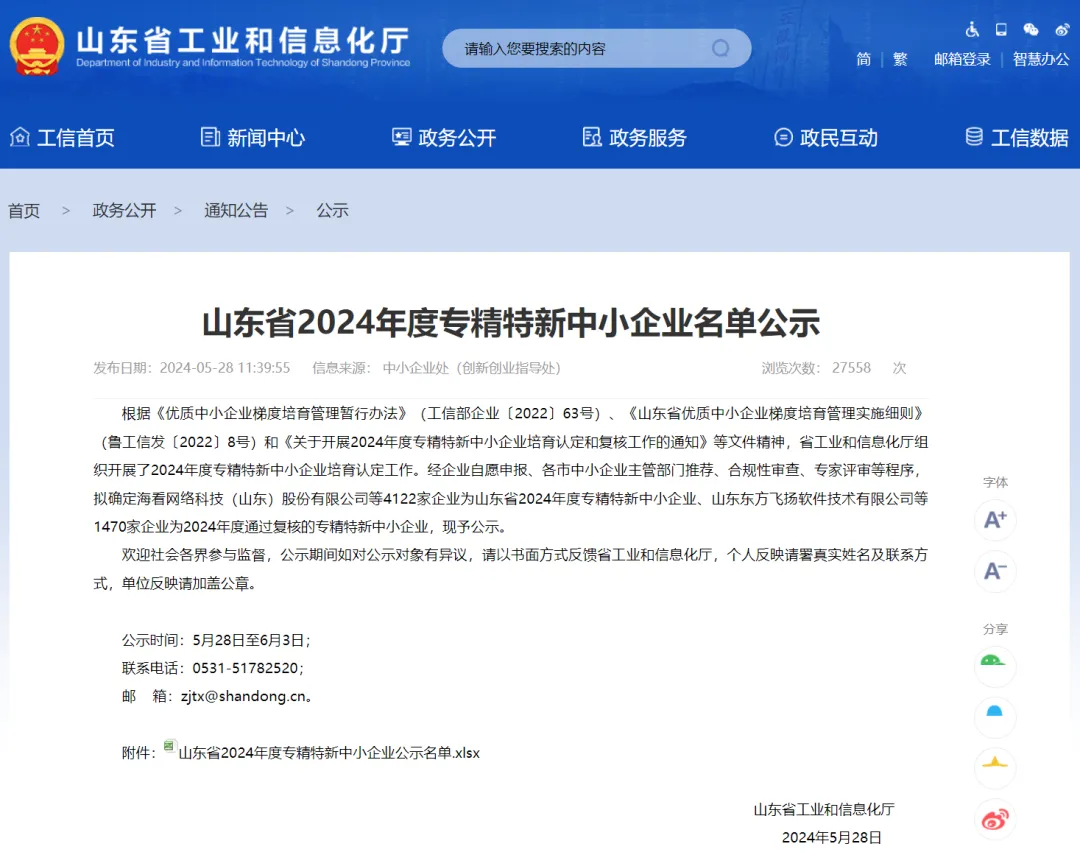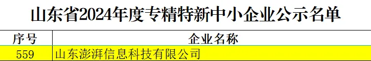 近日,山東省工業(yè)和信息化廳發(fā)布了《山東省2024年度專精特新中小企業(yè)名單公示》,山東文旅集團科技發(fā)展有限公司權(quán)屬單位山東澎湃信息科技有限公司(簡稱“澎湃科技”)成功入選山東省2024年度專精特新中小企業(yè),這是澎湃科技繼通過高新技術(shù)企業(yè)認定之后又一殊榮。