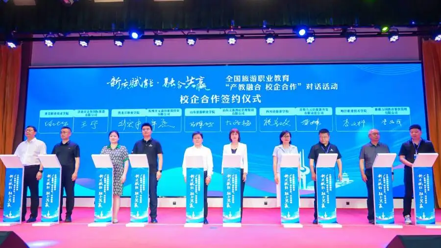 6月27日至28日,由全國旅游職業(yè)教育教學(xué)指導(dǎo)委員會主辦,文化和旅游部科技教育司、山東省文化和旅游廳、山東省教育廳指導(dǎo)的全國旅游職業(yè)教育“產(chǎn)教融合 校企合作”對話活動在山東旅游職業(yè)學(xué)院舉辦?;顒由?,山東文旅酒店集團與山東旅游職業(yè)學(xué)院簽署校企合作協(xié)議。