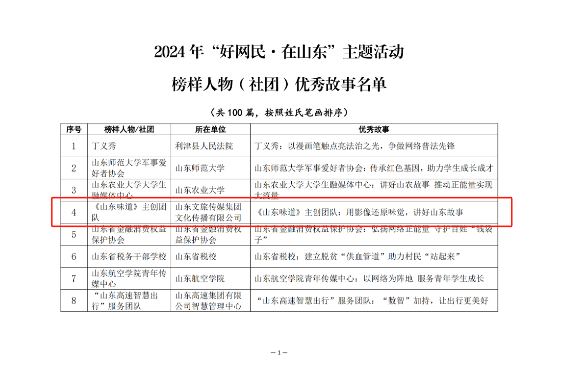 山東文旅傳播出品的大型系列美食紀錄片《山東味道》榮獲2024年“好網(wǎng)民· 在山東”榜樣人物(社團)優(yōu)秀故事獎。2024年“好網(wǎng)民?在山東”主題活動由省委網(wǎng)信辦、省總工會、團省委、省婦聯(lián)、省教育廳、省衛(wèi)生健康委、省國資委、中國人民銀行山東省分行、省稅務(wù)局、中國鐵路濟南局集團有限公司主辦,聚焦愛國主義精神、網(wǎng)絡(luò)法治觀念、文明用網(wǎng)習(xí)慣、網(wǎng)絡(luò)安全技能、責(zé)任擔(dān)當(dāng)意識等基本素養(yǎng)的新時代好網(wǎng)民。