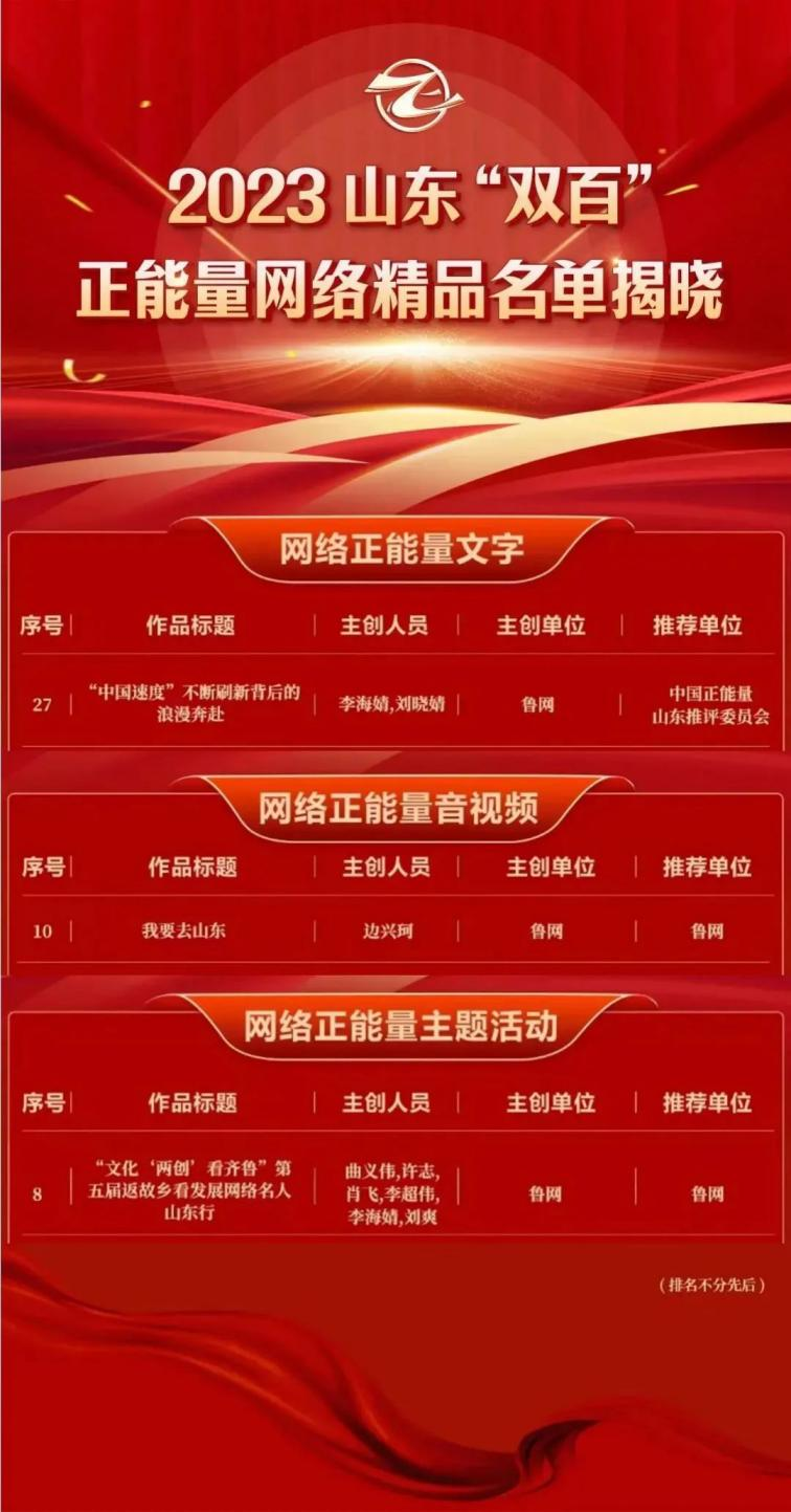 由山東省委網(wǎng)信辦主辦的2023山東“雙百”正能量網(wǎng)絡(luò)精品評選中,魯網(wǎng)作品《“中國速度”不斷刷新背后的浪漫奔赴》《我要去山東》《“文化‘兩創(chuàng)’看齊魯”第五屆返故鄉(xiāng)看發(fā)展網(wǎng)絡(luò)名人山東行》分獲網(wǎng)絡(luò)正能量文字、網(wǎng)絡(luò)正能量音視頻與網(wǎng)絡(luò)正能量主題活動獎項。
