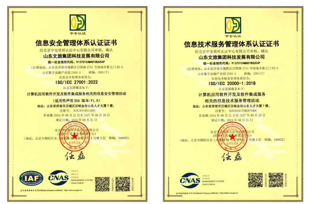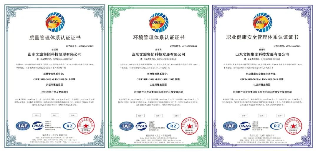 近期,為推進業(yè)務規(guī)范化管理,提升公司市場拓展能力,文旅科技公司通過了由國際標準化組織(ISO)制定的五項管理體系認證。其中包括,作為企業(yè)管理現(xiàn)代化重要標志的ISO9001質(zhì)量管理體系、ISO14001環(huán)境管理體系、ISO45001職業(yè)健康安全管理體系等三項體系,以及信息軟件開發(fā)行業(yè)必備的ISO20000信息技術(shù)服務管理體系認證、ISO27001信息安全管理體系認證等兩項體系。