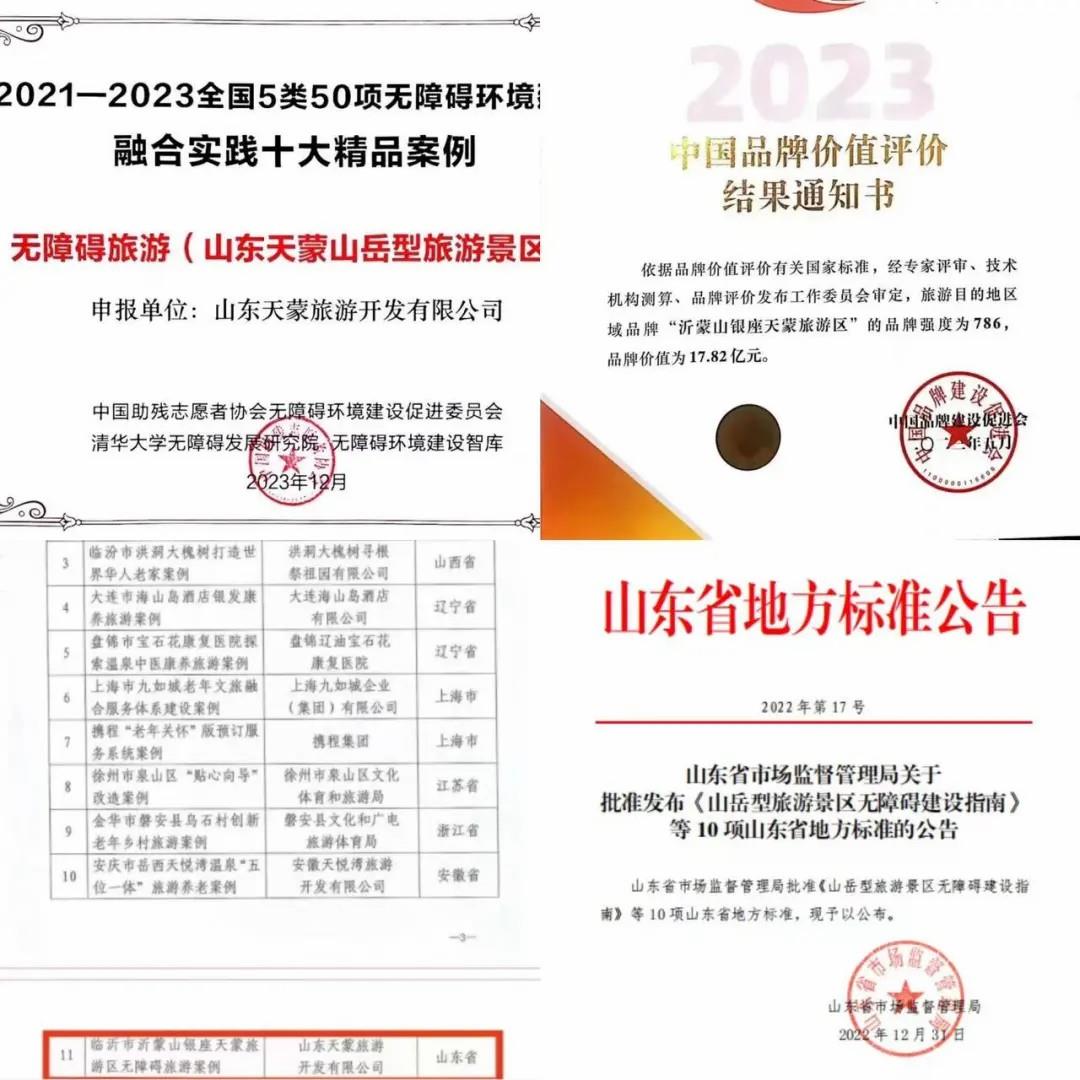 天蒙景區(qū)一直致力于為游客打造高品質(zhì)的旅游產(chǎn)品及舒心的旅游環(huán)境。2023年由天蒙景區(qū)主持起草的省地方標(biāo)準(zhǔn)《山岳型旅游景區(qū)無障礙建設(shè)指南》正式發(fā)布?!兑拭缮姐y座天蒙旅游區(qū)無障礙旅游案例》在2023年先后入選了“全國老年旅游典型案例”“2023年無障礙環(huán)境建設(shè)優(yōu)秀典型案例”“2021一2023全國5類50項無障礙環(huán)境建設(shè)融合實踐十大精品案例”。此外,天蒙景區(qū)還成功入選“2023年國家級森林康養(yǎng)試點建設(shè)基地”名單;在2023中國品牌價值評價榜單中沂蒙山銀座天蒙旅游區(qū)最終評估品牌強度系數(shù)達到786,品牌價值為17.82億元。