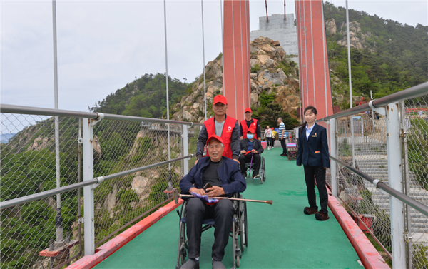 在費(fèi)縣天蒙山景區(qū),黨員志愿者陪同殘疾人朋友乘坐索道、途經(jīng)無障礙游步道到達(dá)了海拔近千米的世界第一人行玻璃懸索橋,和其他游客一同登山賞景,幫助他們實(shí)現(xiàn)無障礙旅游的夙愿。隨后,在《沂蒙山小調(diào)》誕生地,大家參觀展館,唱響沂蒙紅歌,追憶崢嶸往昔,緬懷革命先烈,開展了一堂生動(dòng)的黨史教育課。