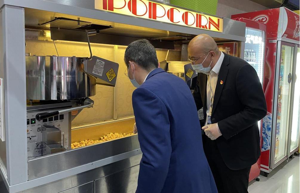 集團(tuán)黨委委員、副總經(jīng)理、機(jī)關(guān)黨委書記孫超和一支部的成員一道,通過為顧客制作爆米花和飲品、對(duì)影廳進(jìn)行消毒和衛(wèi)生清理,體驗(yàn)了影城經(jīng)營(yíng)一線的日常服務(wù)項(xiàng)目。