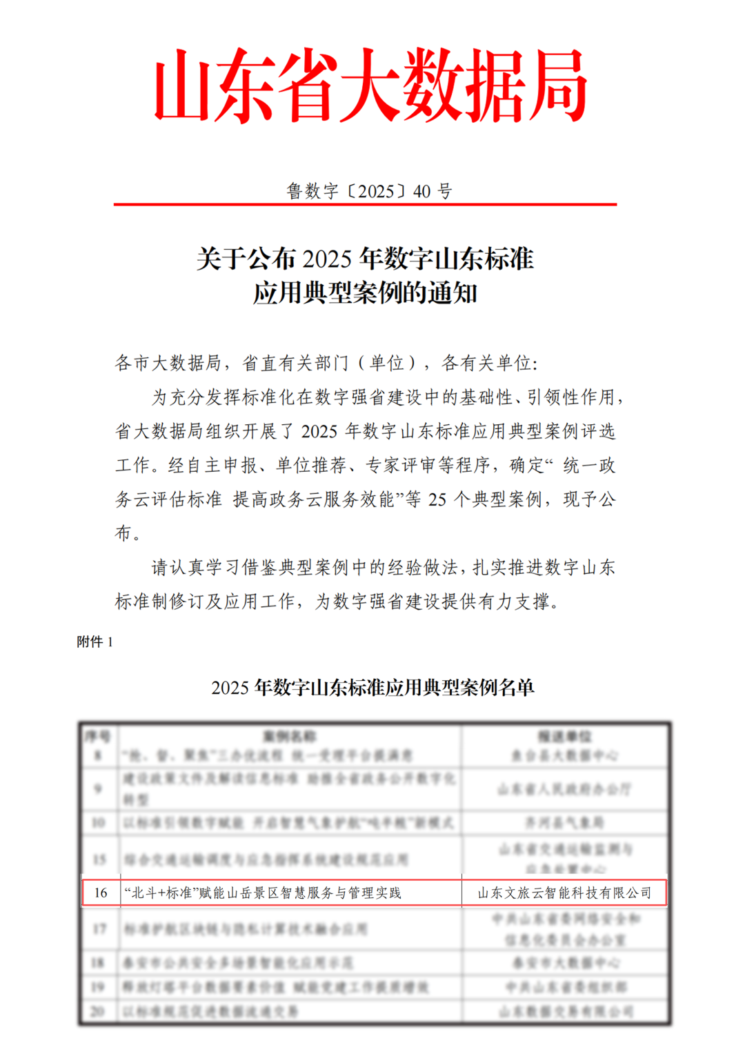 近日,山東省大數(shù)據(jù)局正式公布2025年數(shù)字山東標(biāo)準(zhǔn)應(yīng)用典型案例名單,文旅云公司申報(bào)的《“北斗+標(biāo)準(zhǔn)”賦能山岳景區(qū)智慧服務(wù)與管理實(shí)踐》案例成功入選。