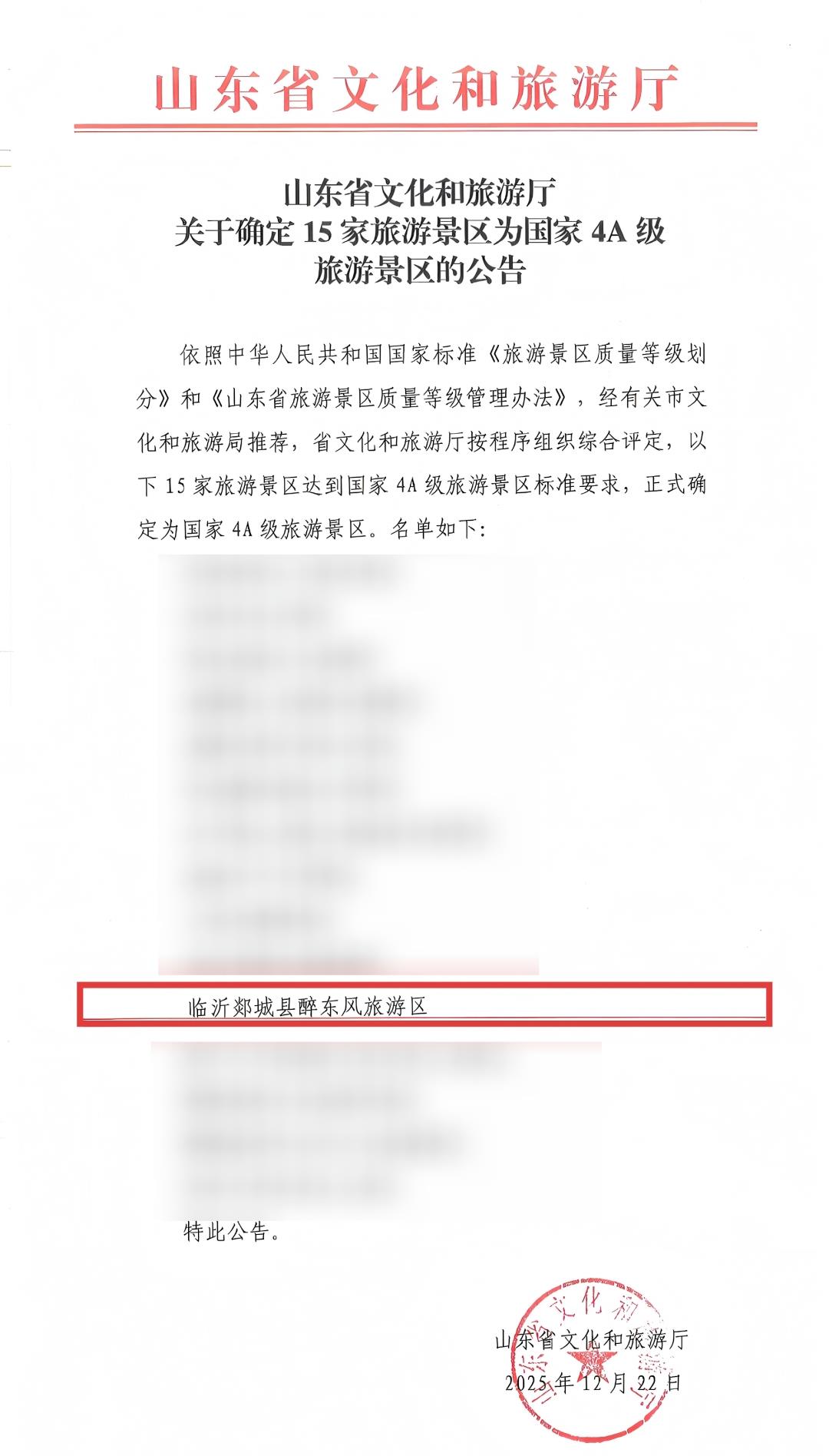12月22日,根據(jù)《旅游景區(qū)質(zhì)量等級(jí)的劃分與評(píng)定》國(guó)家標(biāo)準(zhǔn)和《山東省旅游景區(qū)質(zhì)量等級(jí)管理辦法》,經(jīng)有關(guān)市文化和旅游行政部門(mén)推薦,省文化和旅游廳按程序組織綜合評(píng)定,山東文旅醉東風(fēng)旅游區(qū)達(dá)到國(guó)家4A級(jí)旅游景區(qū)標(biāo)準(zhǔn)要求,正式確定為國(guó)家4A級(jí)旅游景區(qū)。