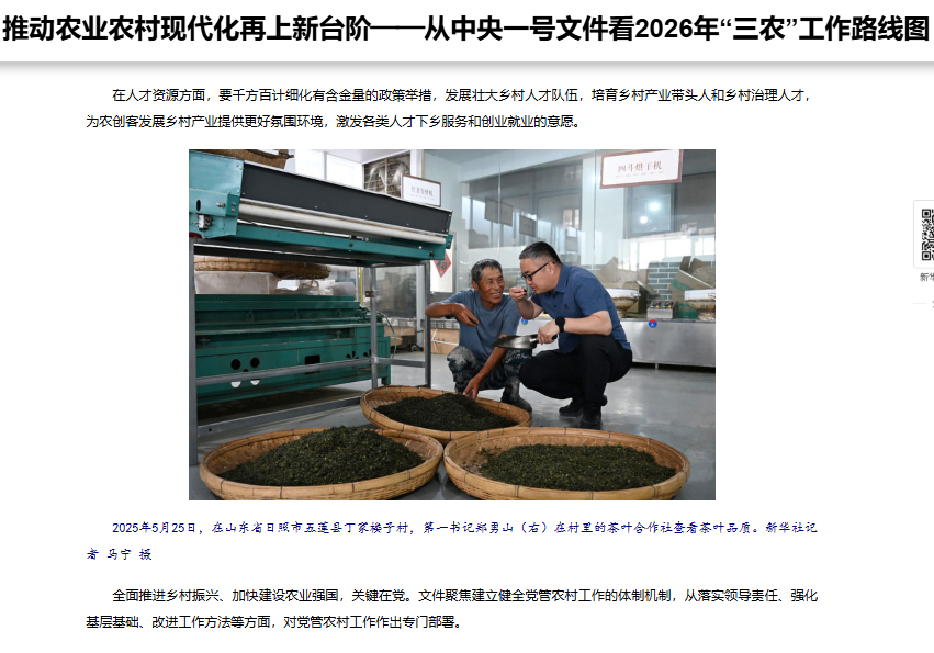 近日,新華社刊發(fā)《推動(dòng)農(nóng)業(yè)農(nóng)村現(xiàn)代化再上新臺(tái)階——從中央一號(hào)文件看2026年“三農(nóng)”工作路線(xiàn)圖》,深度解讀中央一號(hào)文件,山東文旅集團(tuán)派駐五蓮縣第一書(shū)記幫扶工作再次獲得關(guān)注報(bào)道,中國(guó)日?qǐng)?bào)網(wǎng)、央廣網(wǎng)、中國(guó)經(jīng)濟(jì)網(wǎng)、中國(guó)網(wǎng)、中工網(wǎng)、中國(guó)青年網(wǎng)、環(huán)球網(wǎng)等多家中央權(quán)威媒體和多個(gè)省市媒體進(jìn)行廣泛轉(zhuǎn)載報(bào)道。