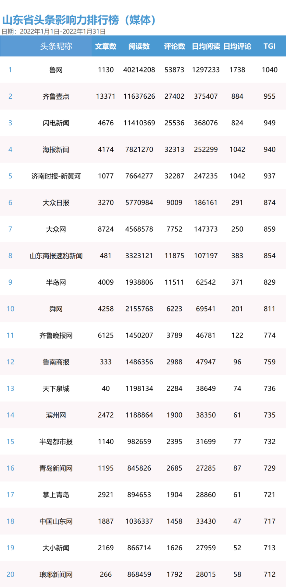 在此前發(fā)布的1月份山東省頭條影響力排行榜(媒體)中,“魯網(wǎng)”均篇傳播效果最佳,篇均閱讀量突破3萬(wàn),共獲得4021萬(wàn)閱讀量、129萬(wàn)日均閱讀量和5萬(wàn)評(píng)論數(shù),超過(guò)榜單中其他媒體賬號(hào),以1040的TGI值位列第一。