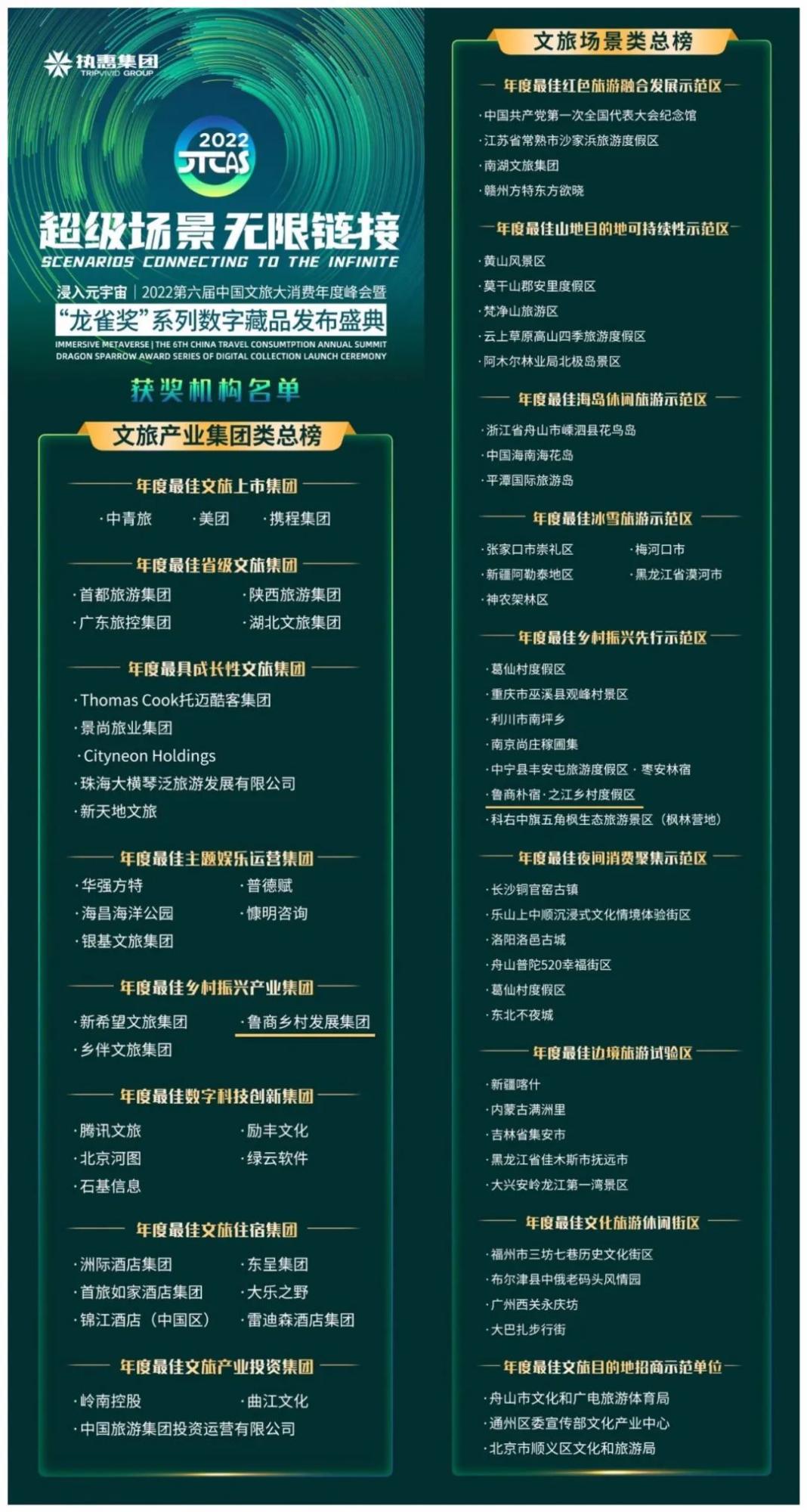 “龍雀獎(jiǎng)”作為文旅行業(yè)最具影響力、公正性且參評(píng)數(shù)量最多的專業(yè)獎(jiǎng)項(xiàng)之一,是唯一完整覆蓋文旅全生命周期的產(chǎn)業(yè)類獎(jiǎng)項(xiàng),旨在表彰該年度在行業(yè)內(nèi)表現(xiàn)出眾的優(yōu)秀機(jī)構(gòu)及個(gè)人。本屆“龍雀獎(jiǎng)”全球評(píng)選開(kāi)啟后,累計(jì)訪問(wèn)量突破2000萬(wàn),總投票數(shù)突破500萬(wàn)。歷時(shí)半年,最終評(píng)選出近5大類維度下40余個(gè)細(xì)分榜單,其中,“年度最佳鄉(xiāng)村振興產(chǎn)業(yè)集團(tuán)”今年共評(píng)選出三家企業(yè),除山鄉(xiāng)集團(tuán)外,獲此殊榮的還有新希望文旅集團(tuán)和鄉(xiāng)伴文旅集團(tuán)。