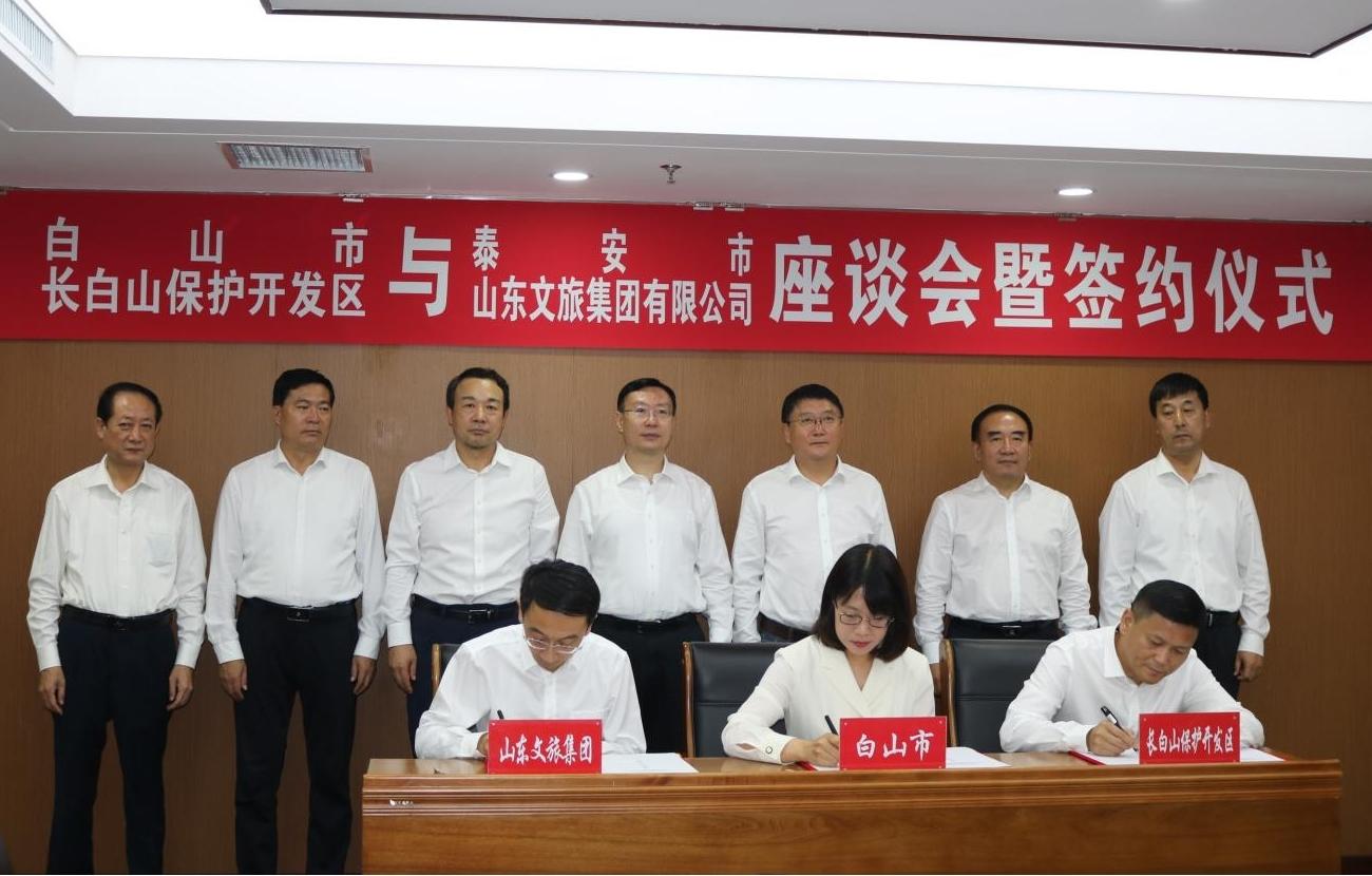 9月14日,泰安市、山東文旅集團(tuán)與白山市、長(zhǎng)白山保護(hù)開發(fā)區(qū)座談會(huì)暨簽約儀式在吉林省白山市舉行。山東文旅集團(tuán)黨委書記、董事長(zhǎng)高洪雷,泰安市委副書記、市長(zhǎng)張濤,白山市委書記、長(zhǎng)白山保護(hù)開發(fā)區(qū)黨工委書記謝忠?guī)r出席并致辭。白山市委副書記、市長(zhǎng)馬堅(jiān)主持座談會(huì)。