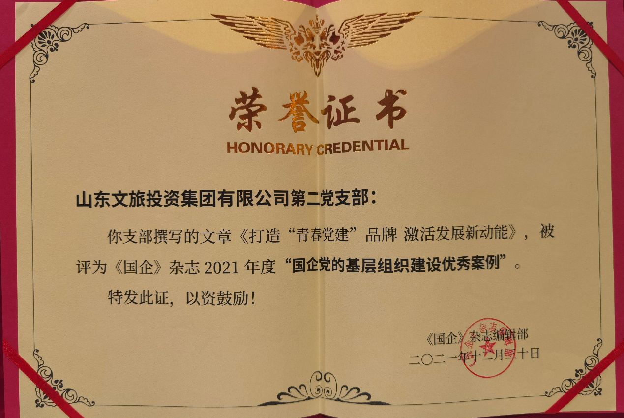同時,在近期省國資委黨委舉辦的“以高質(zhì)量黨建引領(lǐng)省屬企業(yè)高質(zhì)量發(fā)展”推進(jìn)會上,山東文旅集團(tuán)所屬山東文旅投資集團(tuán)有限公司第二黨支部被頒發(fā)“國企黨的基層組織建設(shè)優(yōu)秀案例”榮譽(yù)證書。