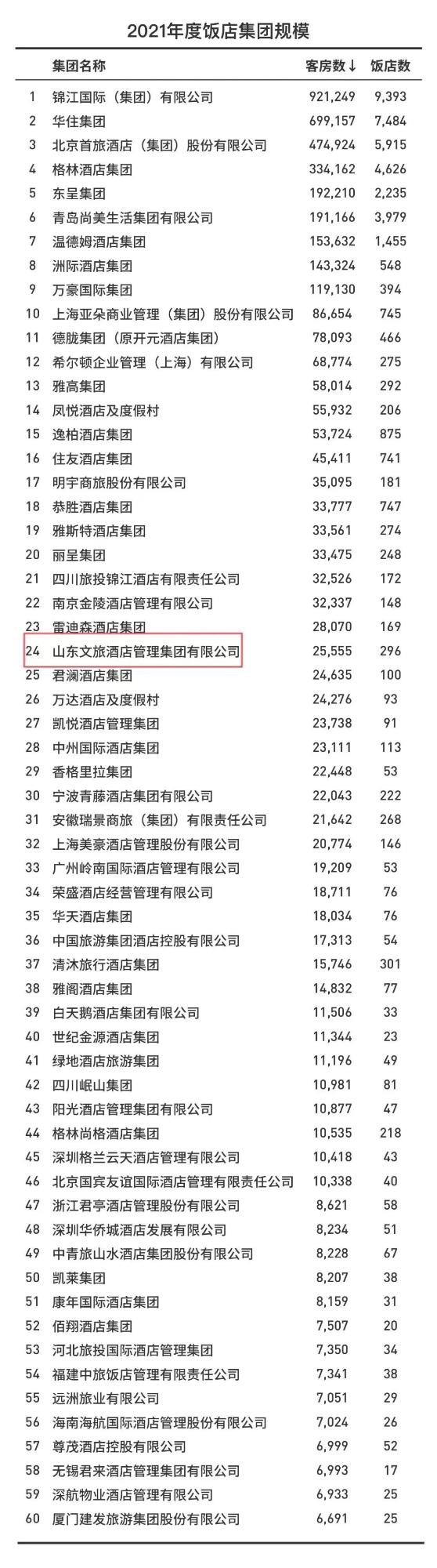 由中國旅游飯店業(yè)協(xié)會(huì)主辦,攜程集團(tuán)、北京眾薈信息技術(shù)股份有限公司協(xié)辦的“2021年度中國飯店集團(tuán)60強(qiáng)”新聞發(fā)布會(huì)于12月29日在北京舉行。中國旅游飯店業(yè)協(xié)會(huì)會(huì)長李峰宣布了“2021年度中國飯店集團(tuán)60強(qiáng)”名單。山東文旅集團(tuán)旗下山東文旅酒店集團(tuán)再度蟬聯(lián)中國飯店集團(tuán)60強(qiáng),規(guī)模位列第24位。