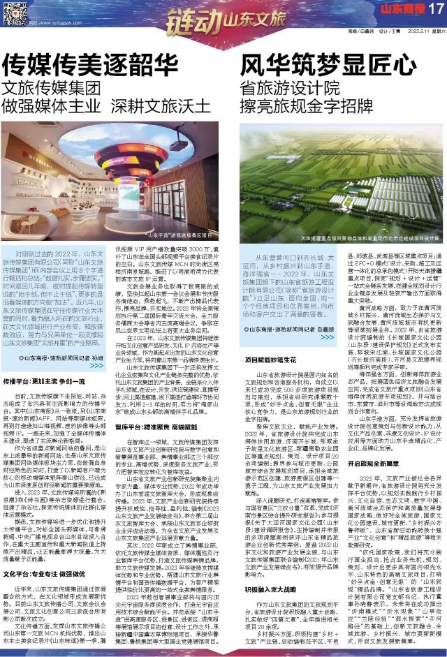 從東營(yíng)黃河口到齊長(zhǎng)城、大運(yùn)河,從鄉(xiāng)村振興到山東手造、海洋強(qiáng)省……2022年,山東文旅集團(tuán)旗下的山東省旅游工程設(shè)計(jì)院有限公司(簡(jiǎn)稱(chēng)“省旅游設(shè)計(jì)院”)立足山東、面向全國(guó),用一個(gè)個(gè)經(jīng)典項(xiàng)目和優(yōu)秀案例,向市場(chǎng)和客戶(hù)交出了滿(mǎn)意的答卷。