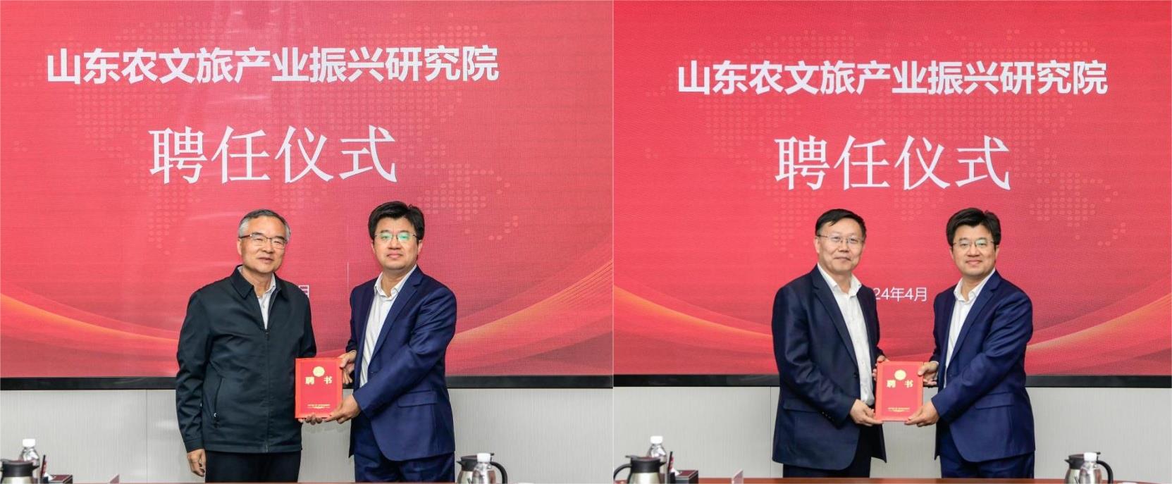 門家春為山東農(nóng)文旅產(chǎn)業(yè)振興研究院名譽院長陳國忠、院長林松柏頒發(fā)聘書