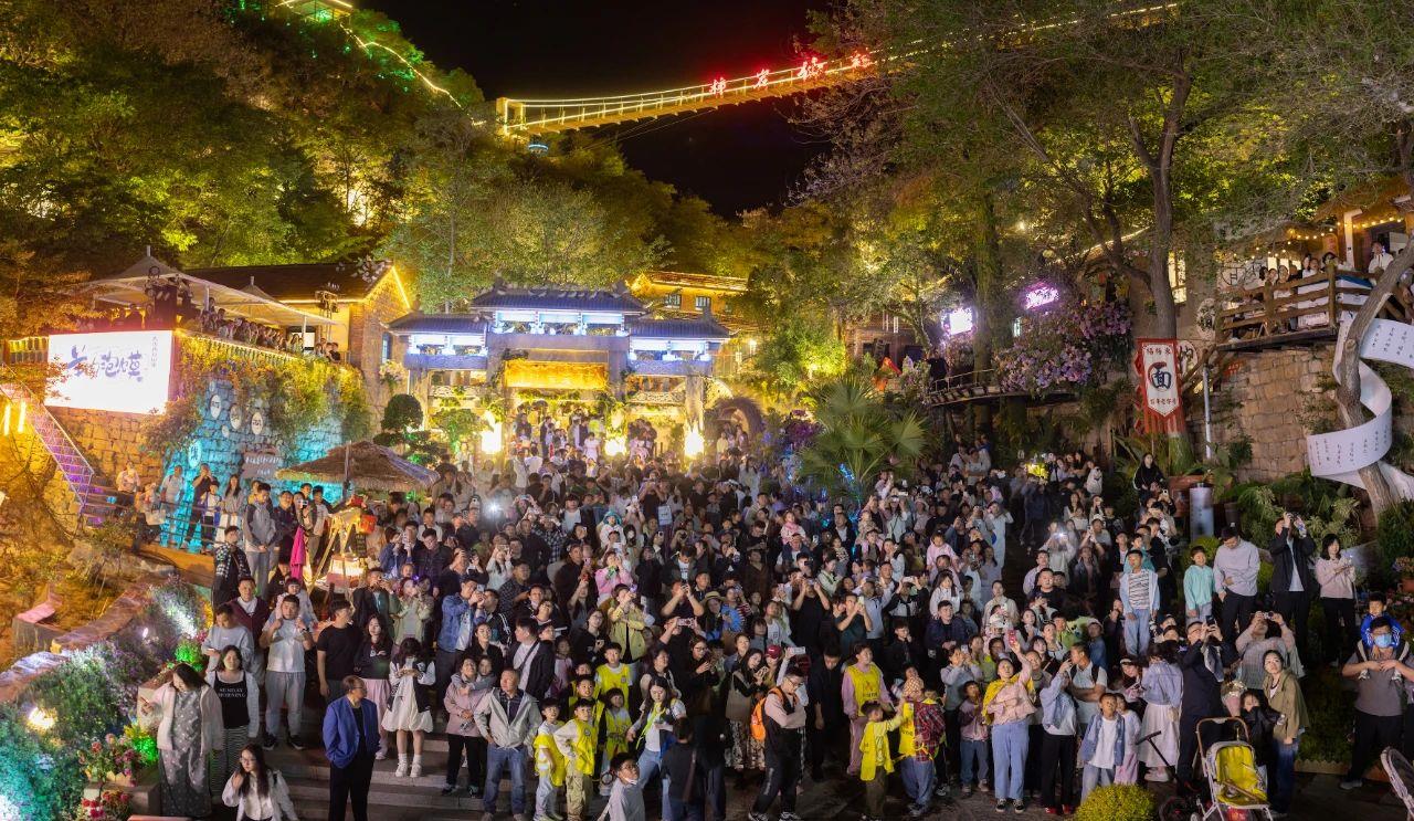 天蒙景區(qū)的《沂蒙山小調(diào)》實(shí)景演藝震撼登場。游客踏入景區(qū),便化身“穿越者”,手持銀票在景區(qū)內(nèi)兌換物資、完成戰(zhàn)時(shí)任務(wù),還能與NPC互動(dòng),沉浸式解鎖“血火歲月”劇情線,讓紅色文旅實(shí)現(xiàn)沉浸式升級,深受游客喜愛。鑫誠田園和萌樂世界讓萌寵經(jīng)濟(jì)跨界破圈,打造“森系電音×萌寵社交×火鍋盛宴”場景,萌鹿伴餐、羊駝巡游、泡泡矩陣與露營天幕構(gòu)成近郊親子游的“多巴胺天堂”。新甫山“世界最長過山車”項(xiàng)目人氣爆棚,鋼鐵巨龍穿梭云霧間,腳下萬株繡球花以莫奈色系鋪就“流動(dòng)油畫”,帶來極限與浪漫的雙重暴擊。五蓮山躺“坪”音樂會邀請武文及原《喜劇學(xué)院》團(tuán)隊(duì)用磁帶金曲喚醒青春記憶,游客枕著花香聽《光陰的故事》,暢享山海之間的音樂療愈。