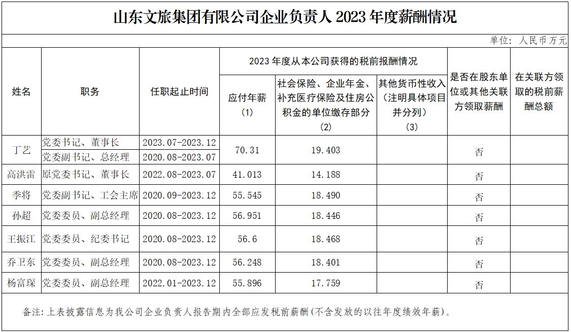 山東文旅集團有限公司企業(yè)負責人2023年度薪酬情況